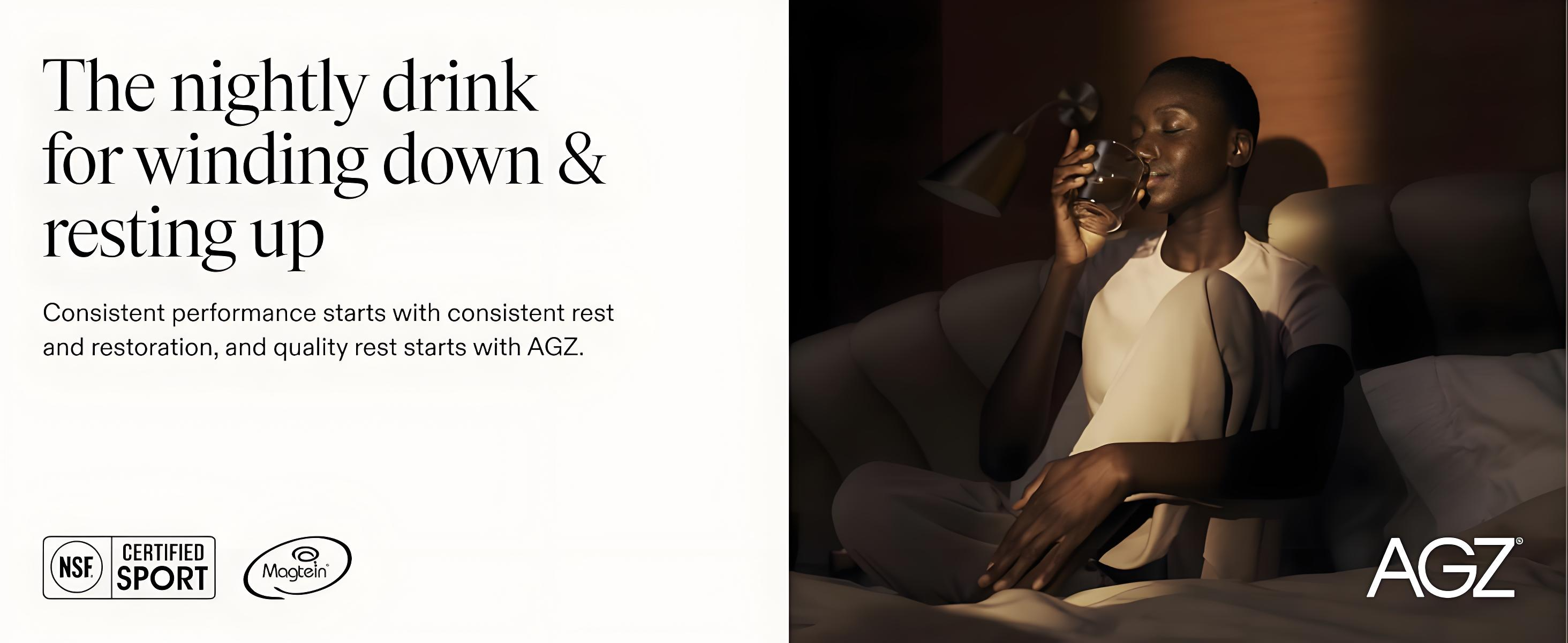 AGZ is a nighttime beverage made with a blend of herbs, magnesium, and adaptogens, crafted into a single convenient serving.