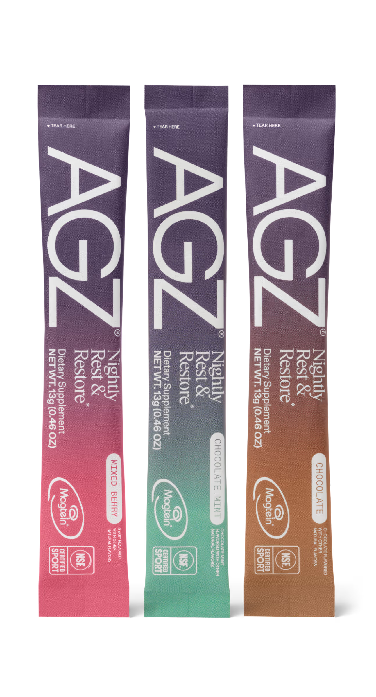 AGZ is available in three flavors: Mixed Berry, Chocolate Mint, and Chocolate